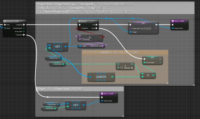 PlayerStartクラスを取得して、PlayerStartTagに特定の値(以下の場合は「Occupied」)が設定されているかを判別することで、開始位置の重複が発生しないように実装しています。