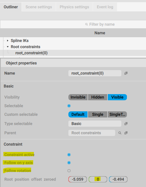 アウトライナーで上記で追加したRoot Constraint(他に作成していなければroot_constraint(0))について、以下の通りに設定します(constraintが対象なので、後で編集でも問題ないと思います)